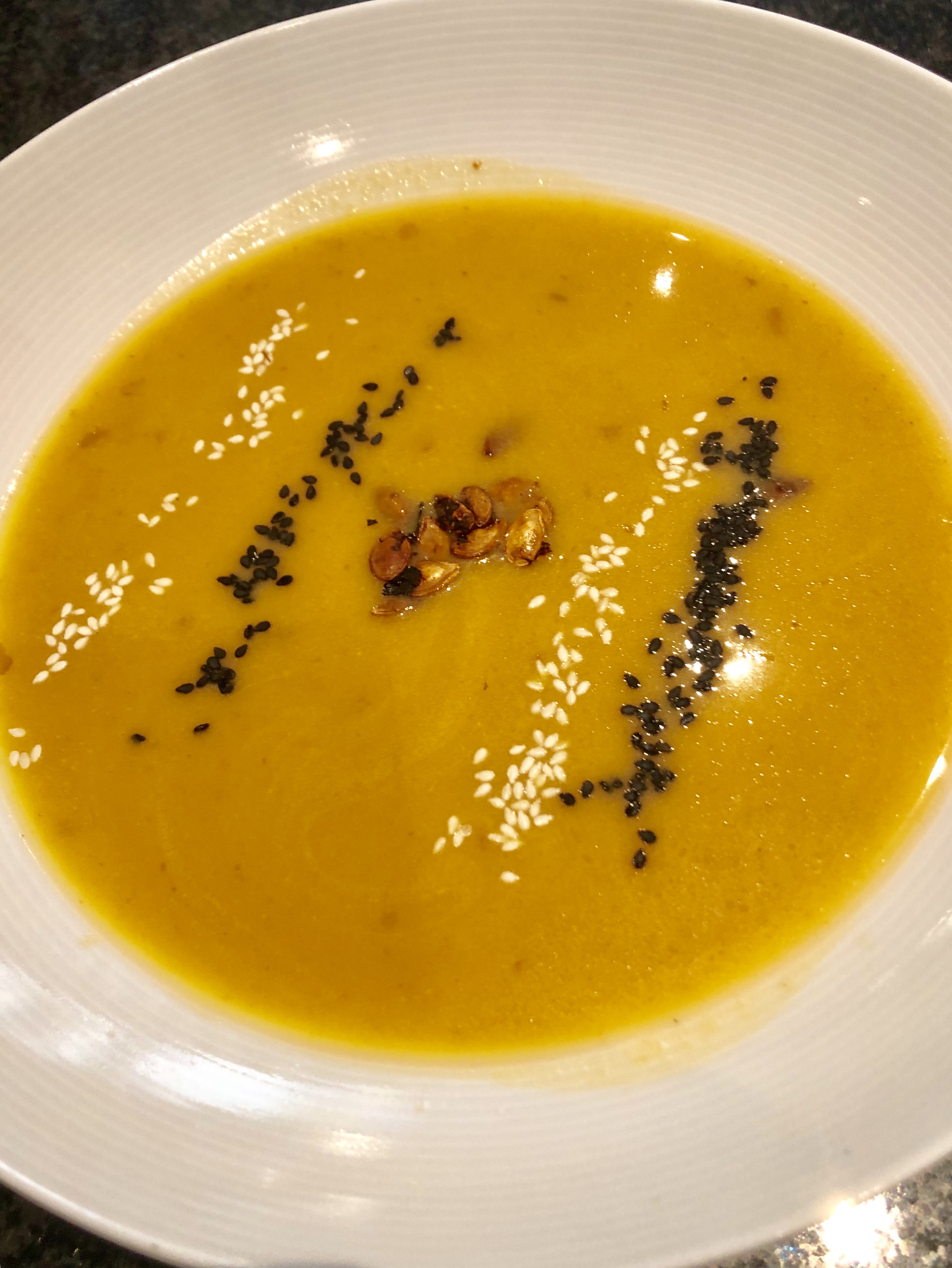 Garnish with pumpkin seeds – pumpkin oil – a dollop of sour cream or yogurt and fresh Coriander.