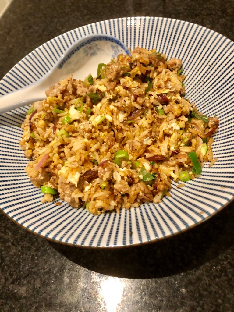 In a very hot pan or a wok, pour the Canola Oil and when very hot, pour the onions and saute until slightly brown on the edges. Add the grated carrot. Do the same with the minced pork. Once cooked, break 2 eggs in a bowl, mix well and pour in with the meat and cook rapidly, ensuring you rotate all the ingredients.