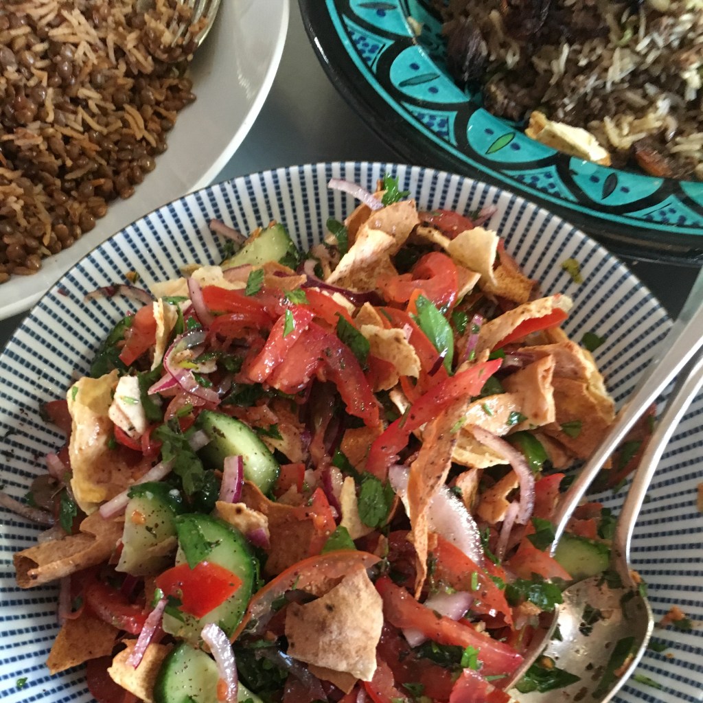 Just before service combine all the dressing ingredients in a bowl and mix thoroughly and pour over the salad – Finish with a garnish of the Pita Bread.