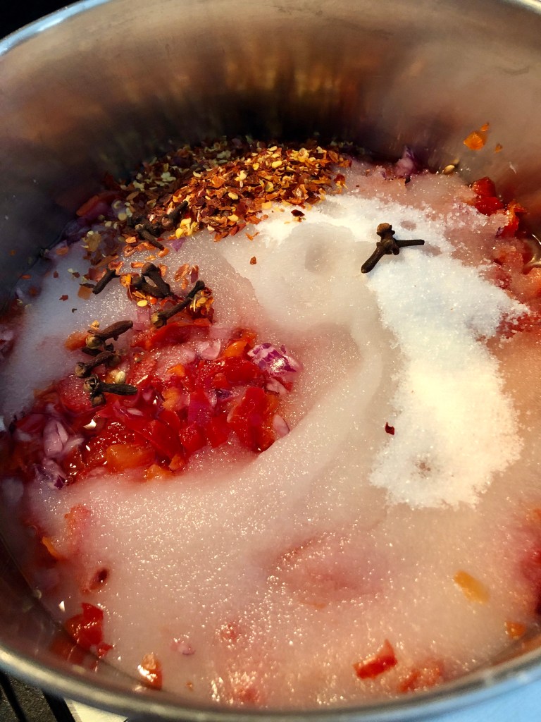 The following day, in a large saucepan put all the ingredients and cook for about 10 minutes, at medium heat, until the peppers are cooked through, making sure you mix well, on a regular basis. Pour the pectin in the mixture and cook for a further 1 minutes.