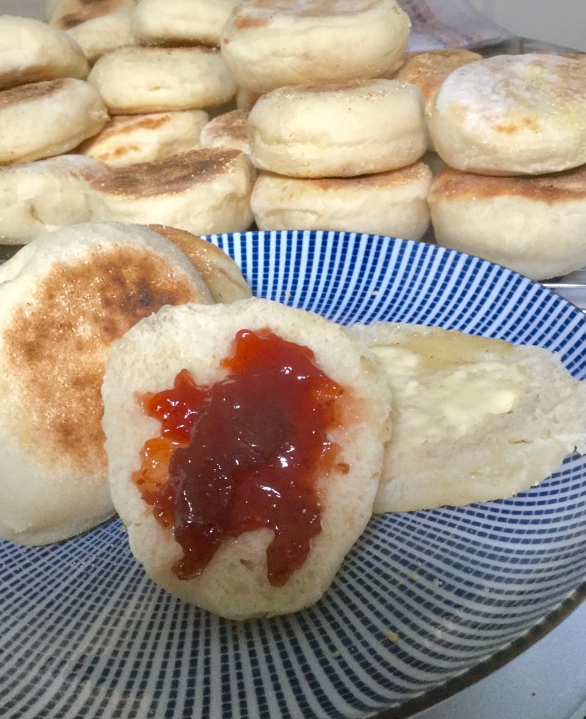These lovely bread-like delicacies, also known as breakfast muffins, originated around 1880 in United Kingdom. As the picture indicates, they are a small, round, flat yeast-leavened bread which is commonly sliced horizontally, toasted, and buttered. Instead of a normal baking in the oven, they are simply cooked on a cast iron oven top pan. The recipe calls for a dough starter, which adds complexity to the bread’s flavour as often used in breads that need a light, open texture with holes. Although a little more time consuming than regular bread, I can assure you, it is well worth the effort and patience as the dough does its magic overnight. When cooked, they are crispy on the outside and tender in the inside, with a lot of small pockets to welcome butter and jam !