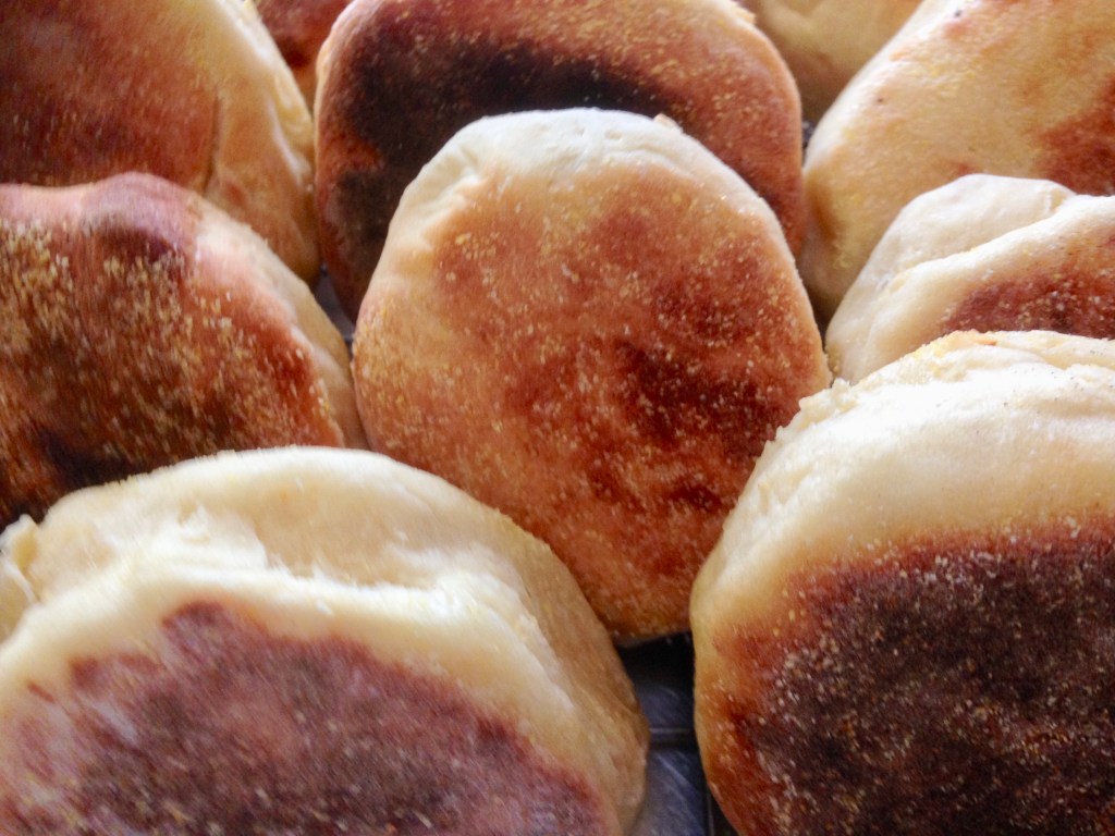 Using a cast iron pan or a griddle pan over medium high heat, grease it slightly with vegetable oil. Griddle the muffins, for about 2 minutes on each side, until browned. A work of patience, you will be tempted to increase the heat of the pan… which might burn the outside and leave the inside raw.