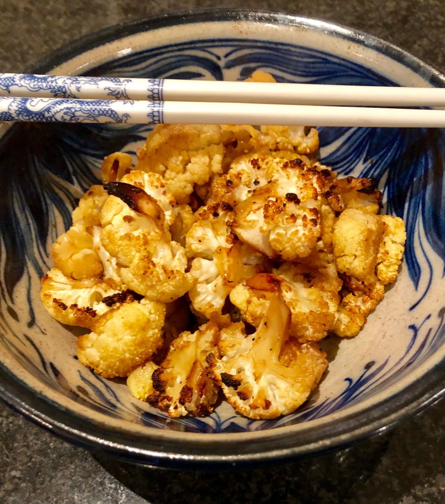 Cut a medium size cauliflower into small florets and place in a plastic sealable bag. Using a small bowl, mix the soya sauce, sesame oil, honey, Sriraha sauce, pepper and olive oil and pour into the bag.