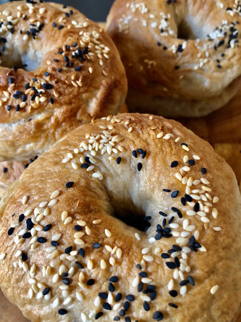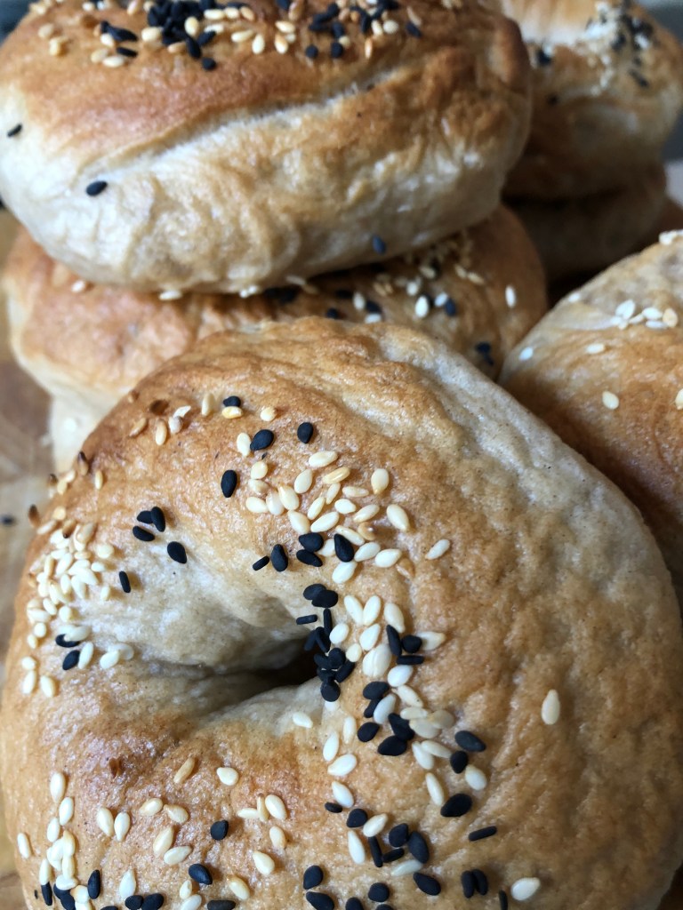 Transfer the bagels, four at a time if possible, to the simmering water. Increase the heat under the pan to bring the water back up to a gentle simmering boil, if necessary. Cook the bagels for 1 minute, flip them over, and cook 1 minute more. Using a skimmer or strainer, remove the bagels from the water and place them back on the baking sheet. Repeat with the remaining bagels. Sprinkle with Sesame Seeds, Black Sesame seeds, black onions seeds, dried garlic or dried onion or a combination of all.