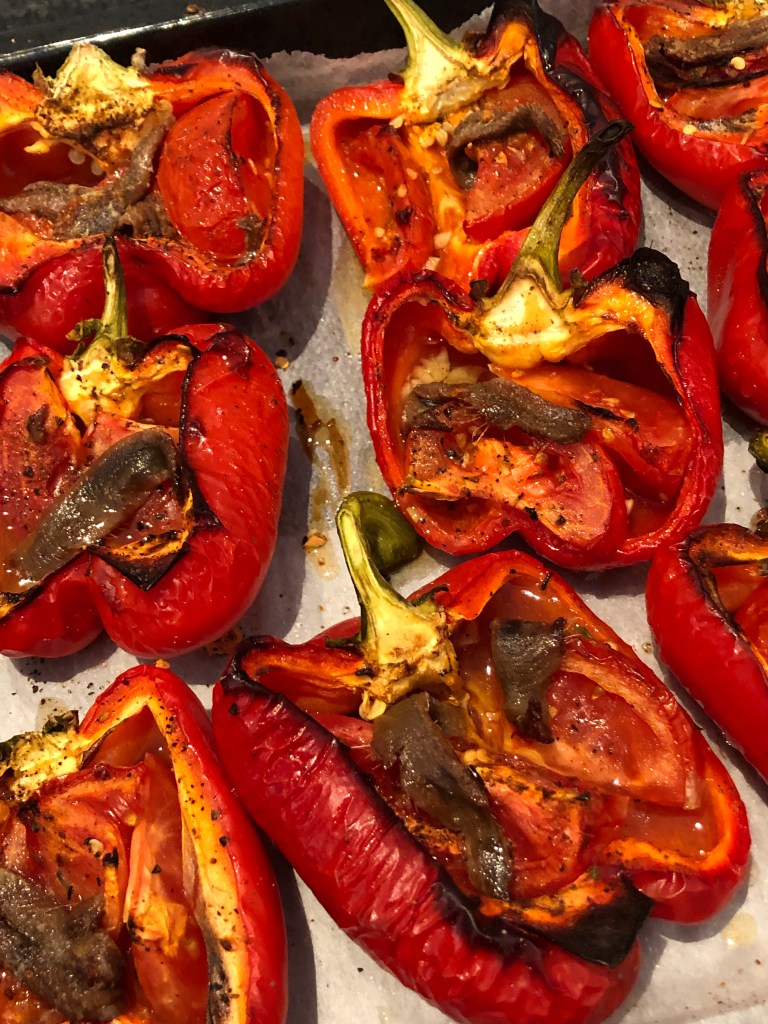 Nyní vložte rajčata do mísy a zalijte vroucí vodou. Nechte po dobu 1 minuty, poté sceďte a oloupejte. Poté nakrájejte rajčata na čtvrtiny a do každé poloviny papriky vložte tři čtvrtiny. Já jsem používám čerstvá rajčata ze zahrady, které není třeba loupat. Do každé poloviny papriky přidejte jednu ančovičku, česnek, chilli a lžičku oleje.