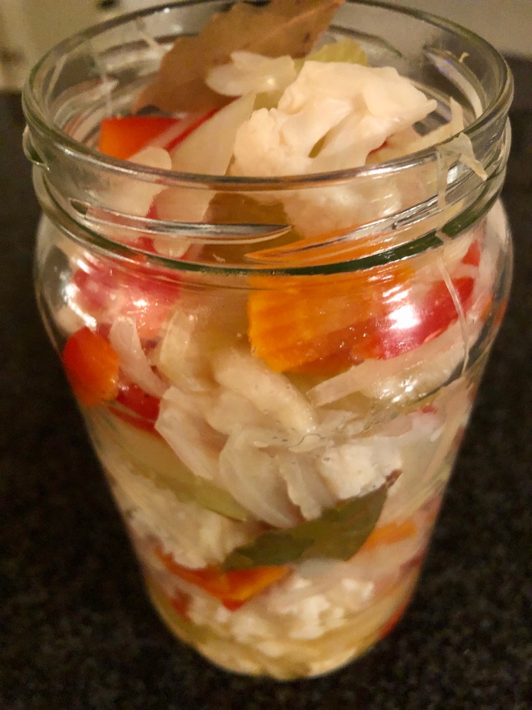 Remove the vegetables and pour in your containers. Wait until the cooking liquid cools down and pour over the vegetables. I keep them at room temperature for 3 days and then put them in the fridge.