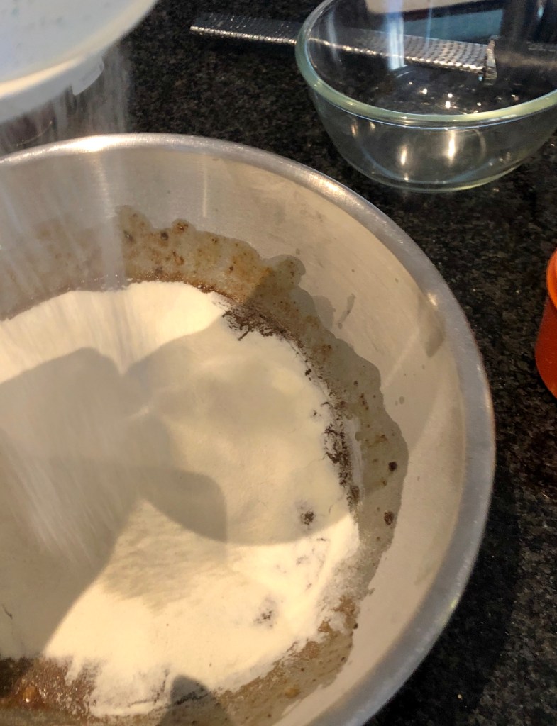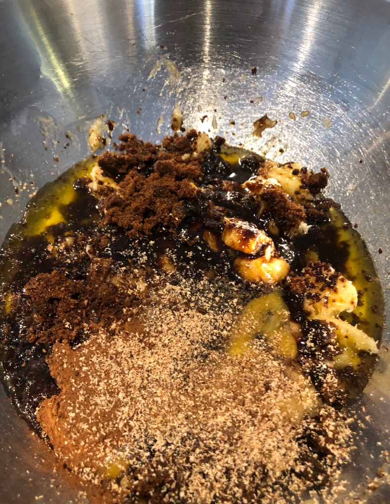 With a fork, mash the bananas finely. It is ok to have a few chunks. Pour in the melted butter in the same mixing bowl. Add the brown sugar, egg, vanilla and rum. Add the spices and finally sift the flour with the soda and salt over the same bowl.