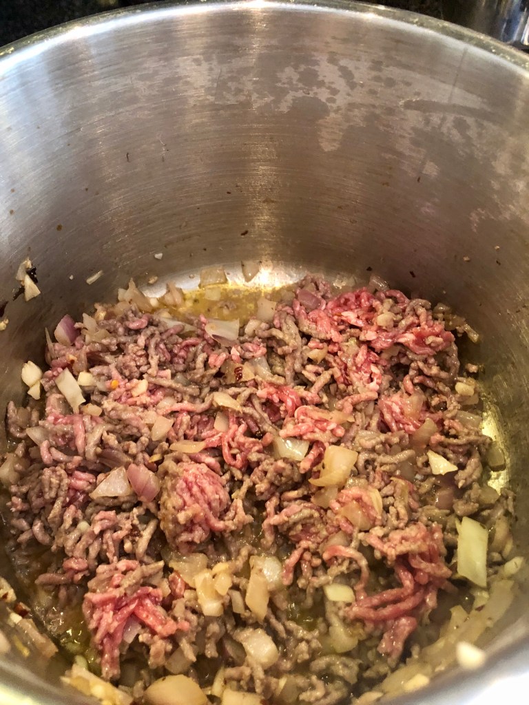 In a large saucepan, saute the garlic, chili flakes and onions, until the onions start to brown at the edges.