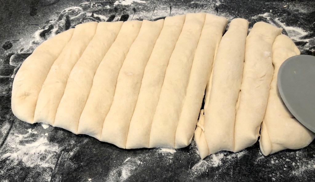Deflate the dough on a counter and form am 30 by 15 cm rectangle. I use a Pizza cutter or chef’s knife and cut the dough into 12 strips. Cover loosely with greased plastic.