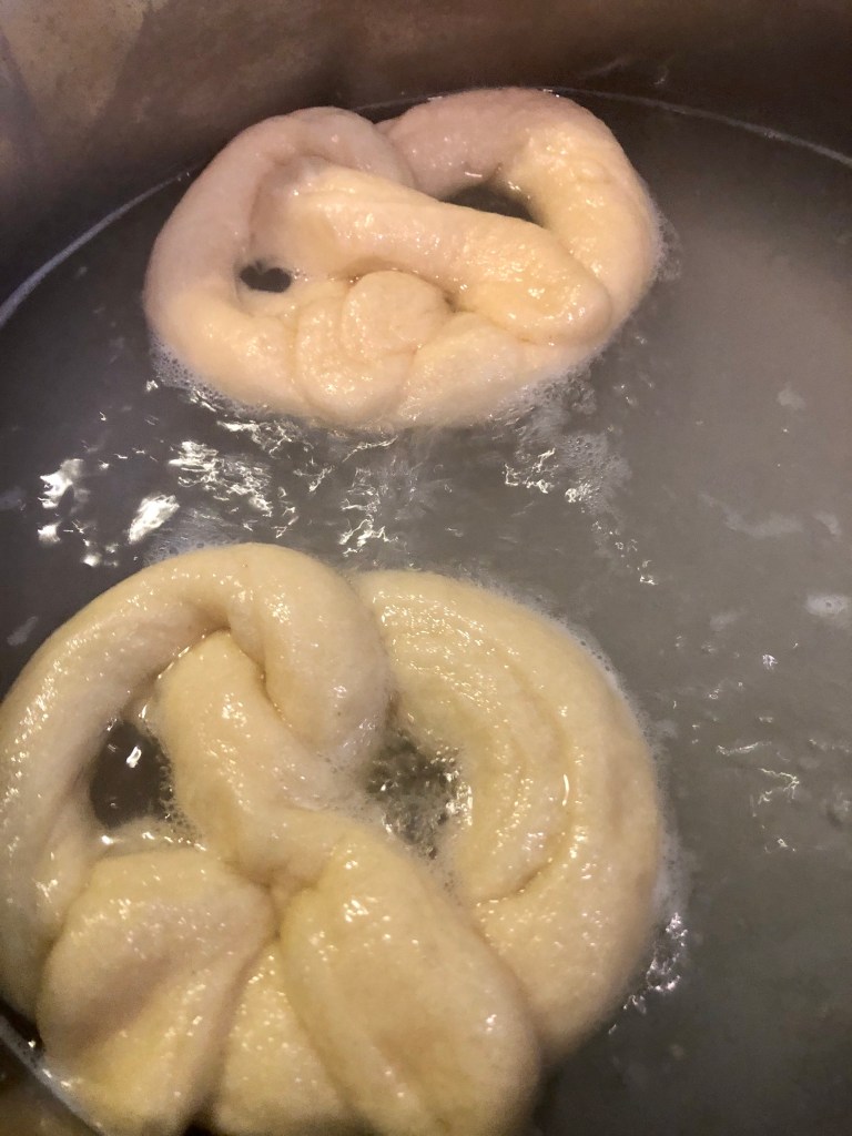 Using a large slotted spoon, put each pretzel in water upside down and cook them for 30 seconds. Turn them over and cook for a further 30 seconds.