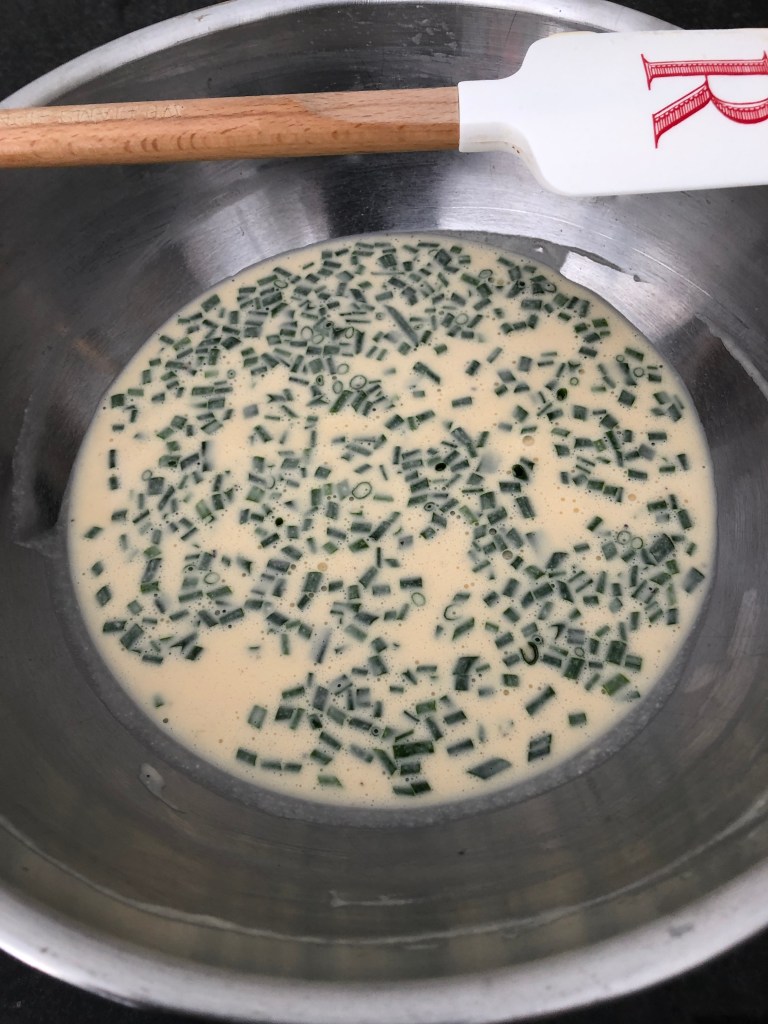 In a large bowl, whisk together the eggs, flour and milk vigorously for a full minute and ensure there are no lumps. Add the chopped chives and parsley and season accordingly. Pour over the hot iron pan and sprinkle with grated Parmesan Cheese.