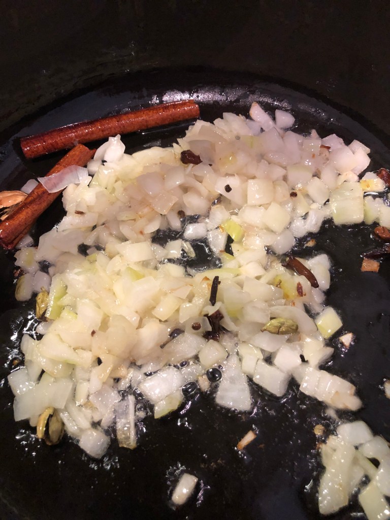 In a wok or large skillet, heat the oil and saute / stir-fry the cardamom pods, cinnamon stick and cloves until fragrant, about one minute. Add the onion and saute until browned on all sides.