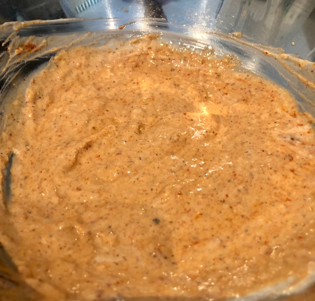 Using a medium-size bowl, stir in the yogurt, ginger, garlic, scallions and all spices and mix well. Incorporate the chicken pieces and mix well, ensuring all pieces are covered in the yogurt paste. Cover with a cling film and place in the refrigerator for a few hours – (2-3 hours).