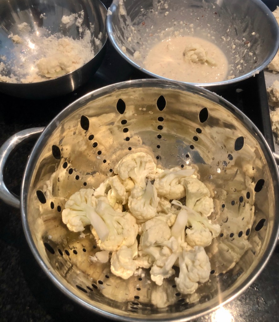 Dip the cauliflower florets in the flour-milk-spices mixture and then transfer to the Panko breadcrumbs.