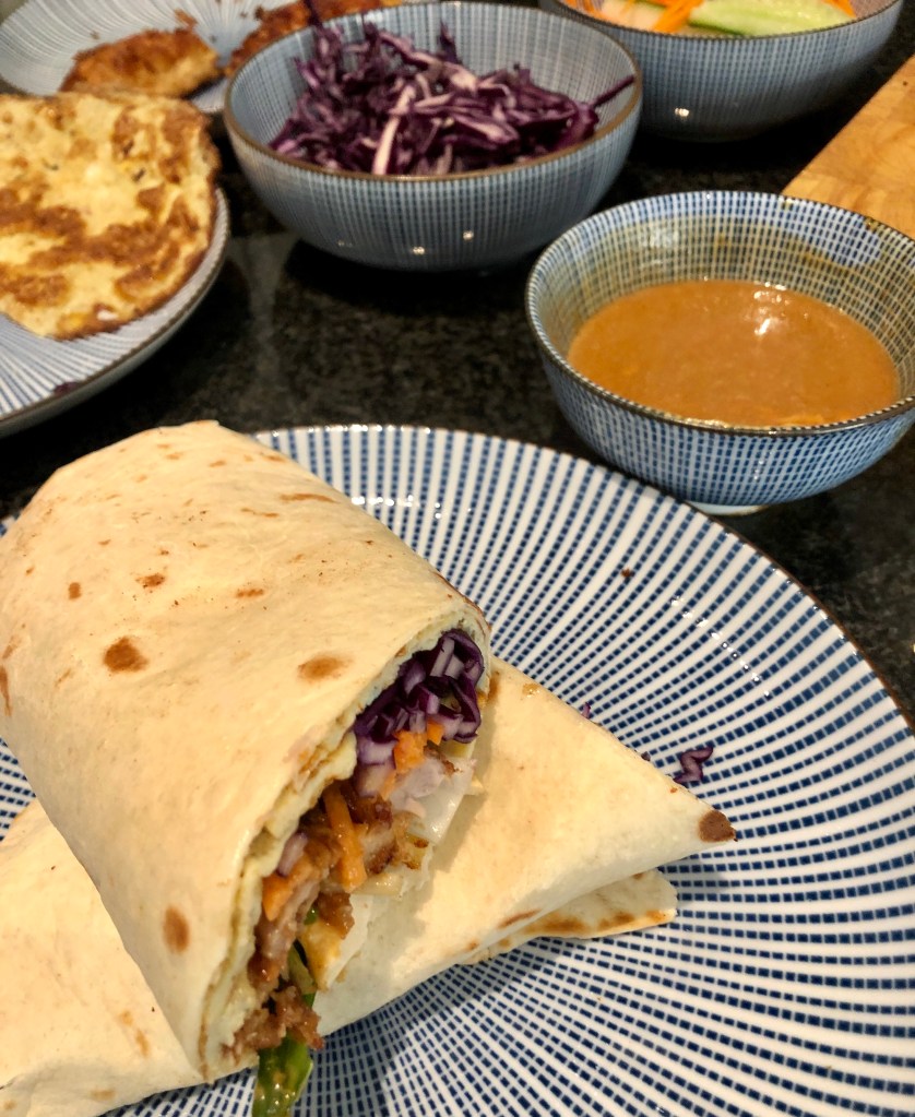 Keep the remaining eggs preparation and in a small pan, with a dash of vegetable oil, scoop half the remaining eggs and fry them until crispy on both sides. You should have enough eggs to make two small omelettes. You will end up with 2 small and thin omelettes which you can slice in pieces, part of the garnish for your wraps.
