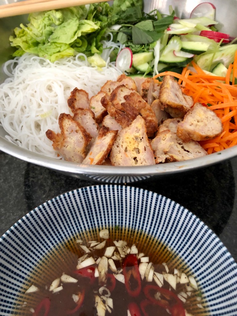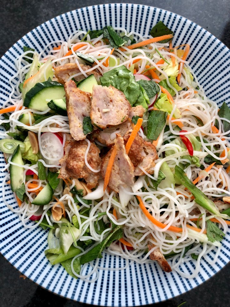 For the rest, simply cut the vegetables and place in a bowl, along with the noodles and meat.