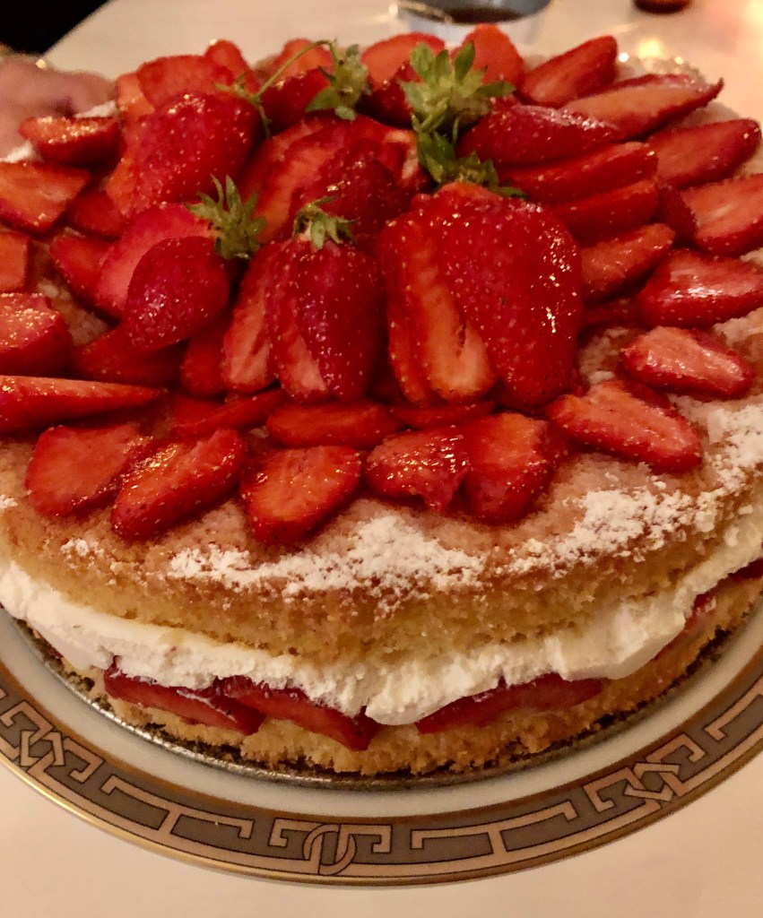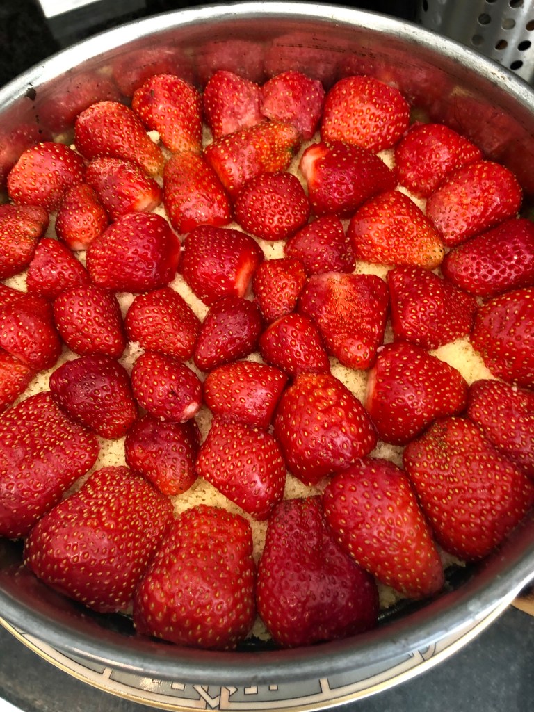 I usually serve the cake with Strawberries when in season. Simply cut your cake in half, or if you feel adventurous and extravagant, in 3 slices. Whip 1/2 litre of 31-35% cream with 1 teaspoon of vanilla extract. When the cream starts to increase in volume, slowly pour the sugar and until fully incorporated. It should form firm peaks.