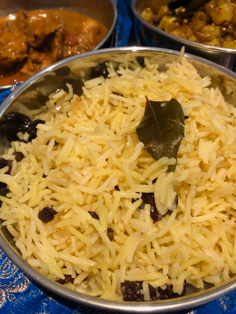 INSTRUCTIONS Put the rice in a bol and wash well in several changes of water. Drain the rice and leave in the strainer over a bowl. Put the oil in a heavy saucepan and set over medium high heat. When hot, put in the cloves, bay leaf, cardamom pods, curry leaves and cinnamon. Stir once once or twice and add the garlic and saute for a minute. As soon as the garlic turns medium brown, add the rice, turmeric and salt. Stir gently for a minute. Add the water and bring to a boil. Reduce the heat to low and cook for 15 minutes. At this stage, you can add the dried fruits and put the lid on. Turn off the heat and let the rice rest for 10 minutes. Using a fork, lightly move the rice grains around and mix the dried fruits. The short cooking time will give you a rather firm rice grain, which we like. Sprinkle the scallions or fresh coriander and serve steaming hot !