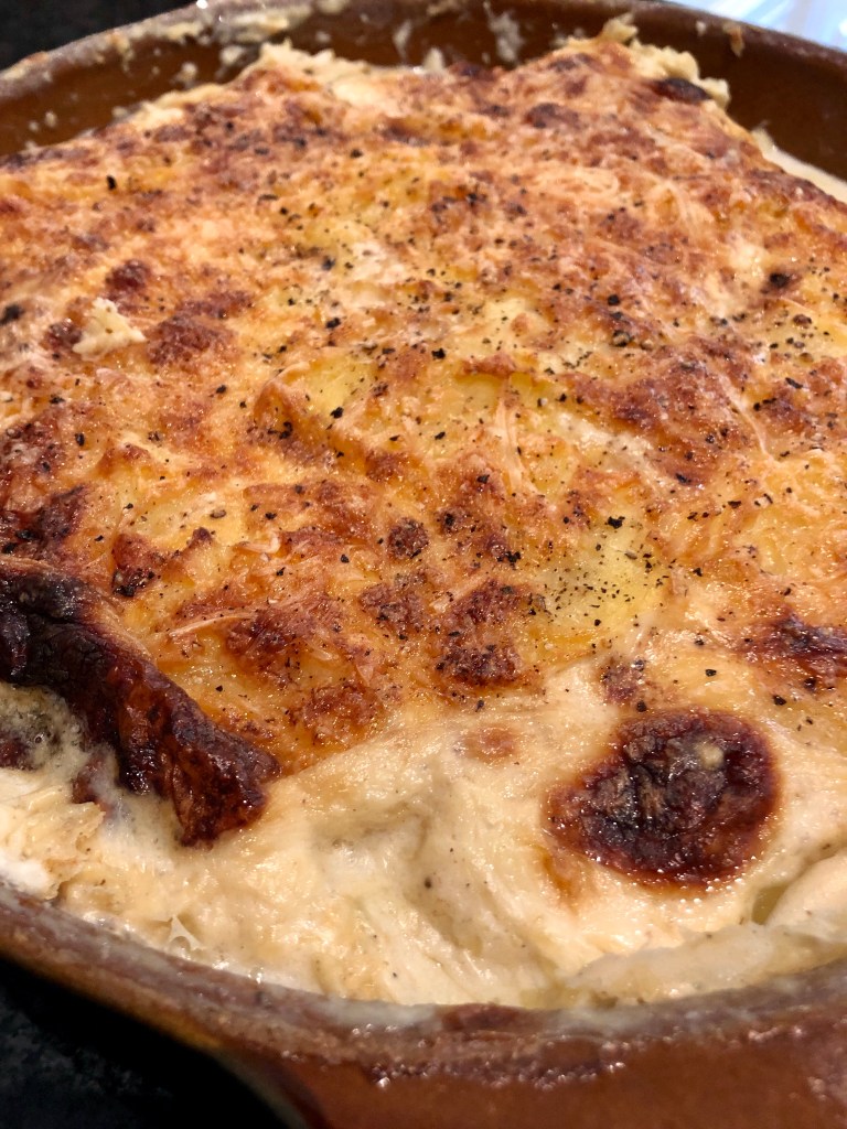 An elegant and classic French dish – The beauty of this dish, not only can you feed a large group of guests, but you can also prepare it in advance, it gets even better. This is a wonderful dish to prepare in the fall when you can indulge in heavier food so to speak. I remember at Hotel School, we spent almost a month talking about potatoes and their different cooking methods. Not only did we learn different ways to prepare them which are endless, but also the various cuts which, according to their size can change the name of the recipe. We learned to not only steam them or boil them, but to cook them in butter, olive oil, goose fat which so tasty, but also bake them individually in aluminum foil. We spent a week learning how to braise them in the oven, with or without cream. The beauty of this humble vegetable, is that although it is so simple, you can elevate it to an elegant and ever so satisfying dish. Potatoes always brings me home with my family of 12 brothers and sisters and the amount of potatoes we went through every week. This was our go-to vegetable at home and although we had it so often, we never got tired of it. On Fridays, my mother would also make french fries… God Bless her soul ! As good Catholics, we abstained from meat, so poor Mother had to start peeling potatoes at 10 o’clock to be ready for lunch … Of course, there were never enough french fries for our group of growing kids and had to clearly define our territories to ensure none would disappear from our plates. Strangely enough, we don’t make french fries at home anymore, as we they are so easily accessible and sometimes even better. But there are so many other lost recipes for potatoes, which we should revive. Here is one we should make more often. Gratin Dauphinois which consist of parboiled then baked potatoes in milk and a little cream. Covered with Emmenthal cheese and grilled. Delicious !