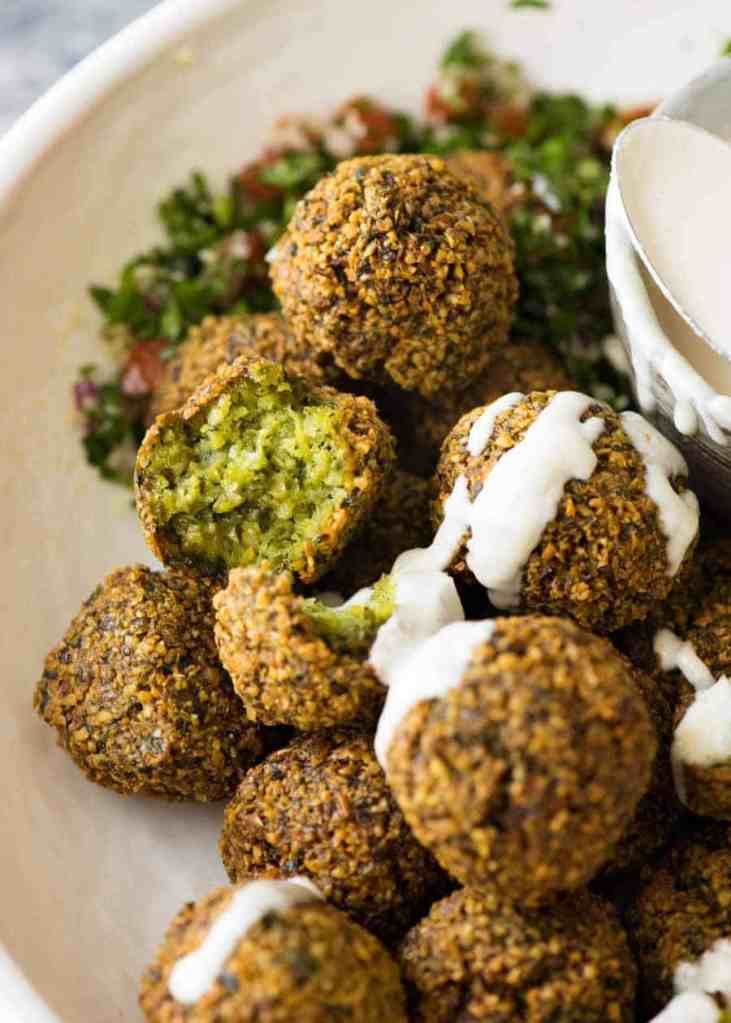 Falafels are the pride and joy of many Middle Eastern countries and many fight to the title to the best. Needless to say, recipes vary from country to country and some are more complicated than others. This version only uses chickpeas and a combination of fresh herbs and spices. Easy to make they bring you a piece of the Middle East without spending days in the kitchen. I usually freeze them uncooked and fry them at the last minute. This is a perfect starter for a Middle East dinner.