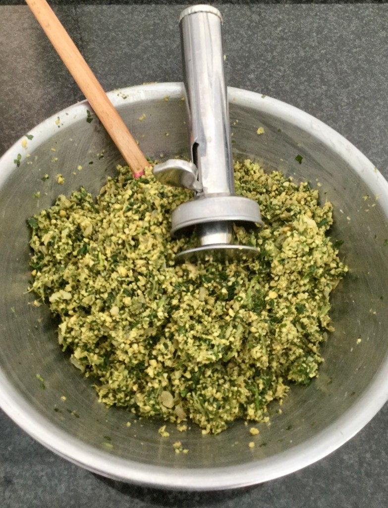 You can use a special instrument to shape the falafels as shown above, or a simple ice cream spoon will also do the trick. The idea is to have consistent sizes so you can cook them at the same time.