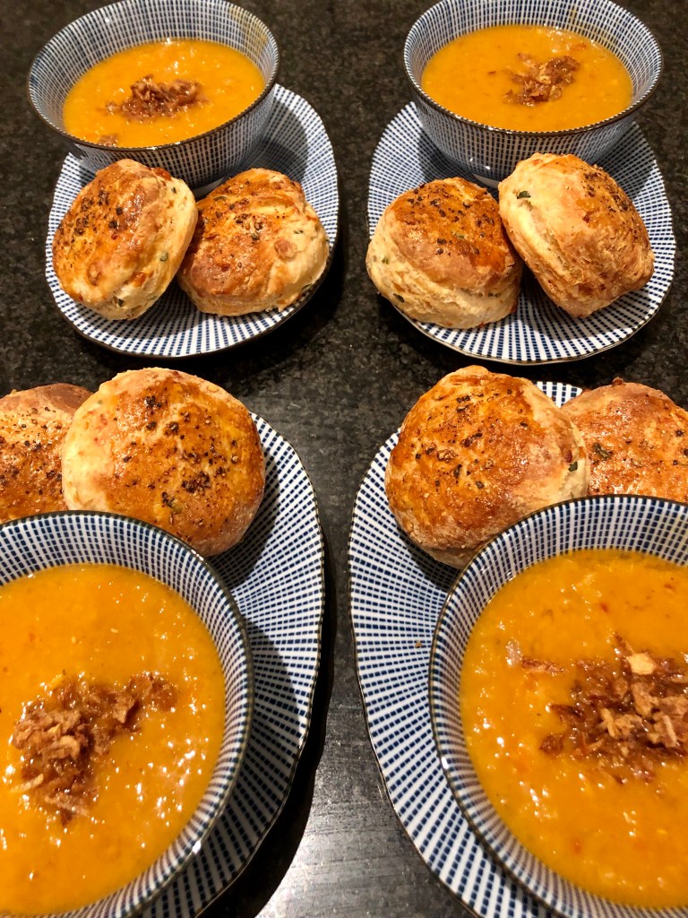Using a rolling pin, flatten the dough to about 4 cm thick. Using a round cutter, start cutting the biscuits making sure to dip the cutter into flour after each cut, otherwise the dough will stick to the cutter.