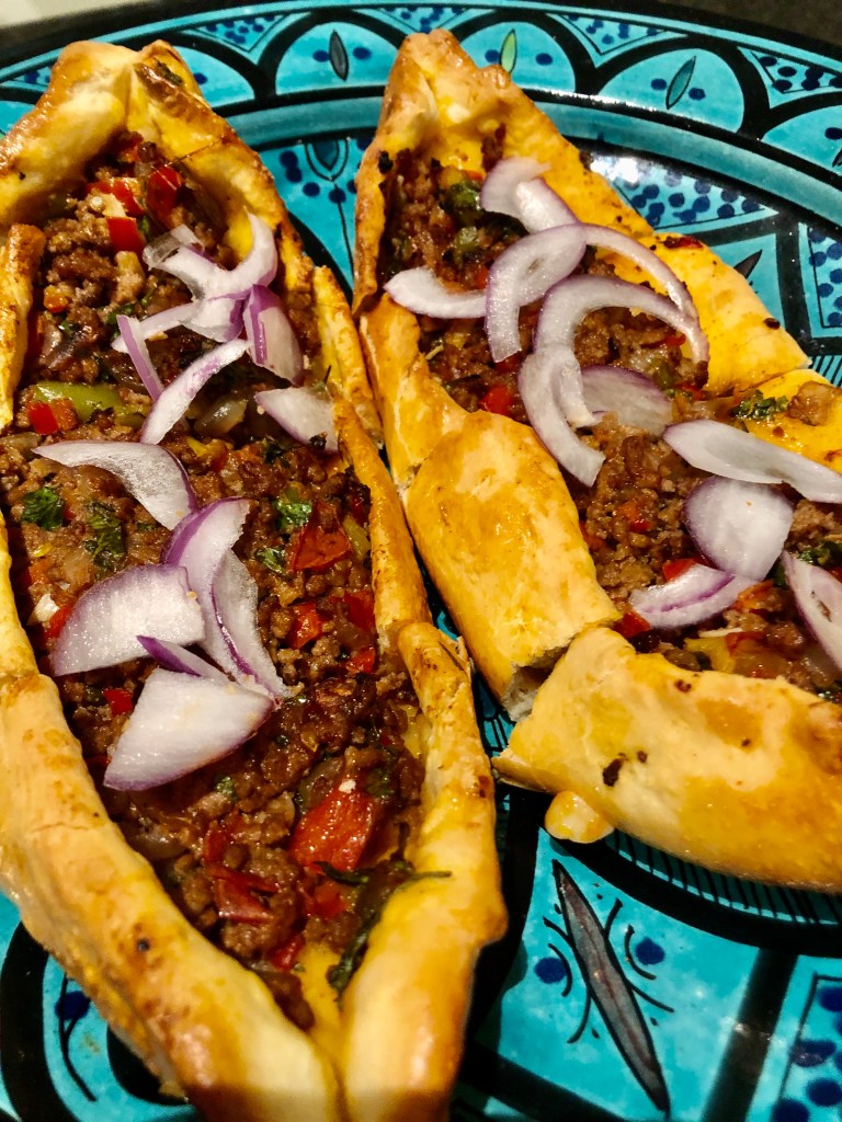 This recipe does take a little time, but all the components can be prepared ahead. The meat preparation can be made ahead and freezes very well. The dough takes a few minutes to prepare and rises in about an hour. The beauty of this dish is that it is very flexible and can be prepared with various types of meat; beef, lamb or even ground chicken. You can easily adapt it for vegetarians with the additions of various vegetables. The dough recipe makes for about 10 Pide and also freezes well. We prepared the meat for 6 and freeze the rest of the dough.