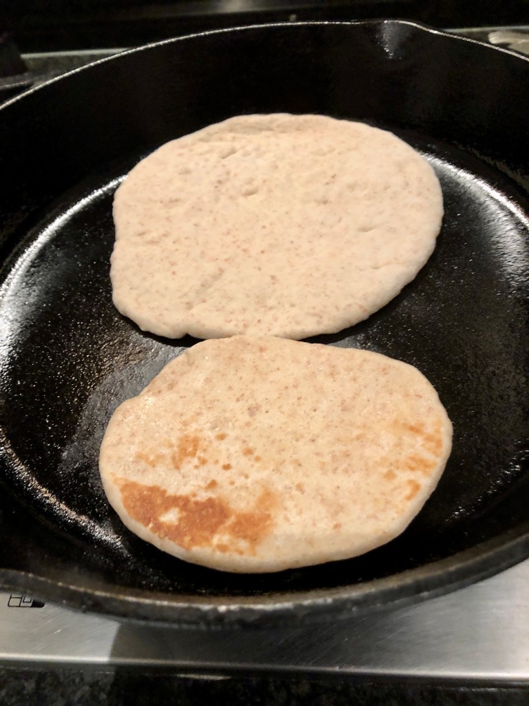 Using a non-stick pan until hot, flatten each ball into 10 cm disks. Place them on the pan and cook them for about 3 minutes. Beautiful brown spots will appear. Flip them over for another 2 minutes.