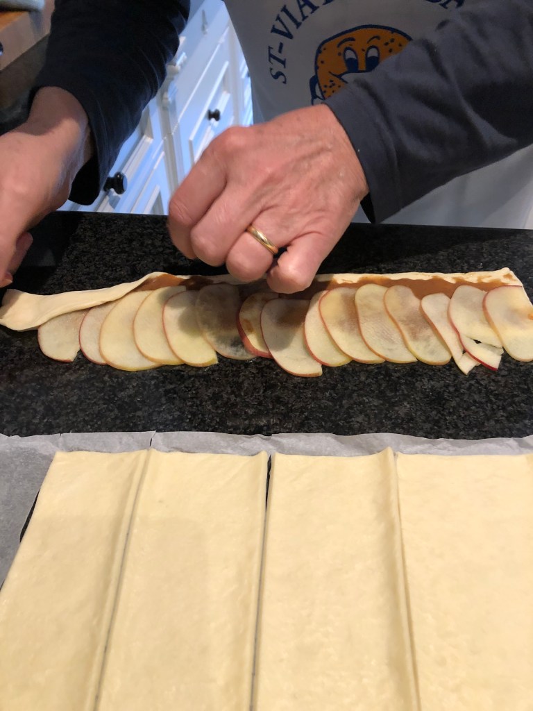 Starting with the first one, spread two tablespoons of the cream cheese mixture on the entire surface of the dough strip. Place slices of apples along the entire dough strip about halfway.