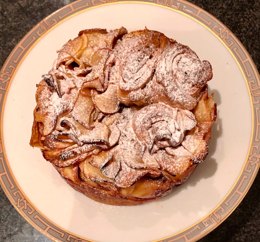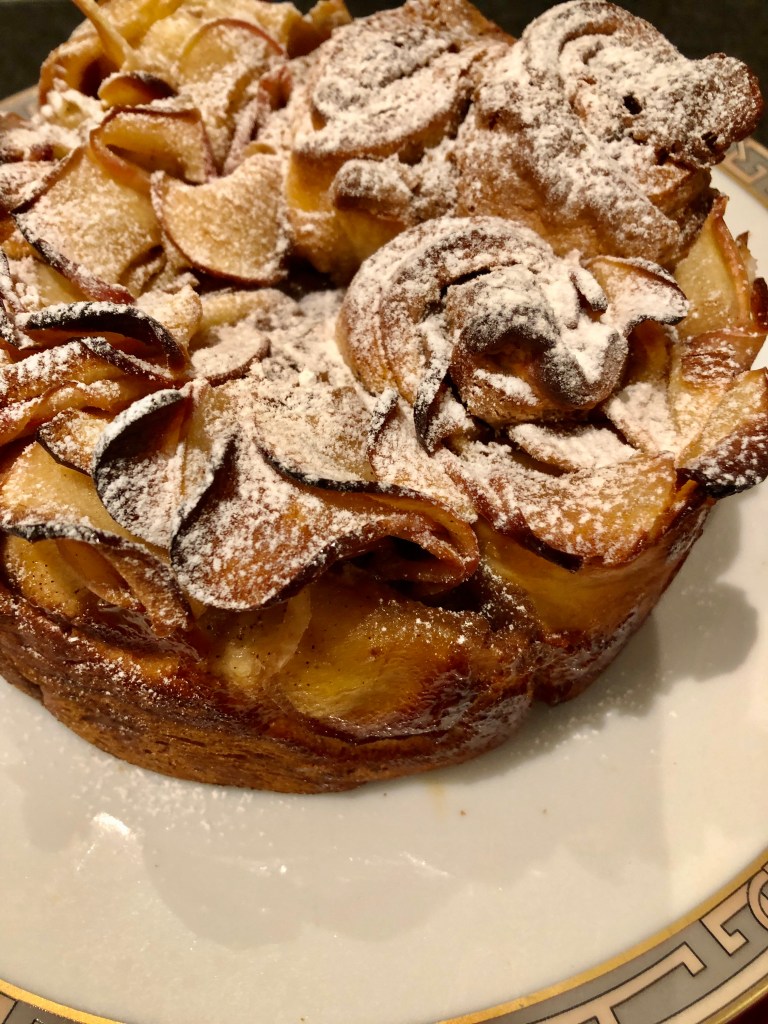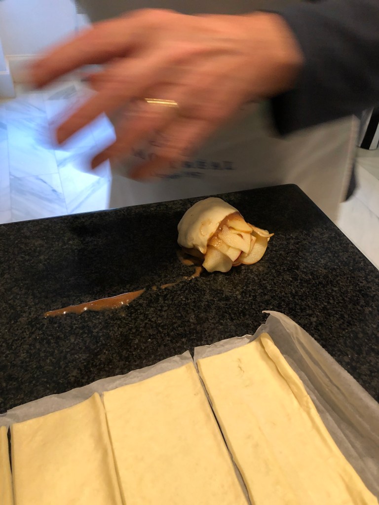 which you slather the cinnamon and cream cheese mixture on. Line up the apple slices on the entire strip of dough, halfway through. Fold the bottom part of the dough to about halfway in the apples, and roll.. Repeat the process until you have 6 roses like. Place them in your baking dish… and voila.