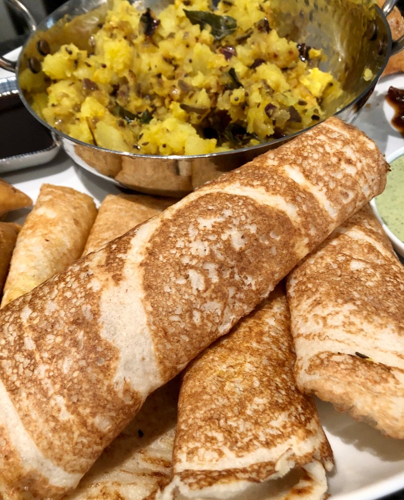 This thin pancake or crepe, originating from South India, is made from a fermented batter consisting of white lentils called Urad dal and Basmati rice. It is somewhat similar to a crepe in appearance, although savoury flavours are generally emphasized.