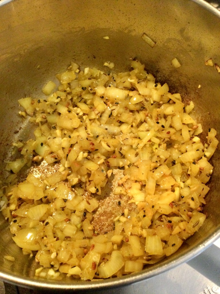 In a medium size pot, heat the vegetable oil and when it starts to smoke, stir in the Fennel, Cumin, Coriander, Nigella seeds and Fenugreek. Saute the spices until they impact their smell. Add the onions and cooks for a few minutes, until they start to brown at the edges. Add the Turmeric, garlic and ginger and cook for two minutes, mixing constantly.