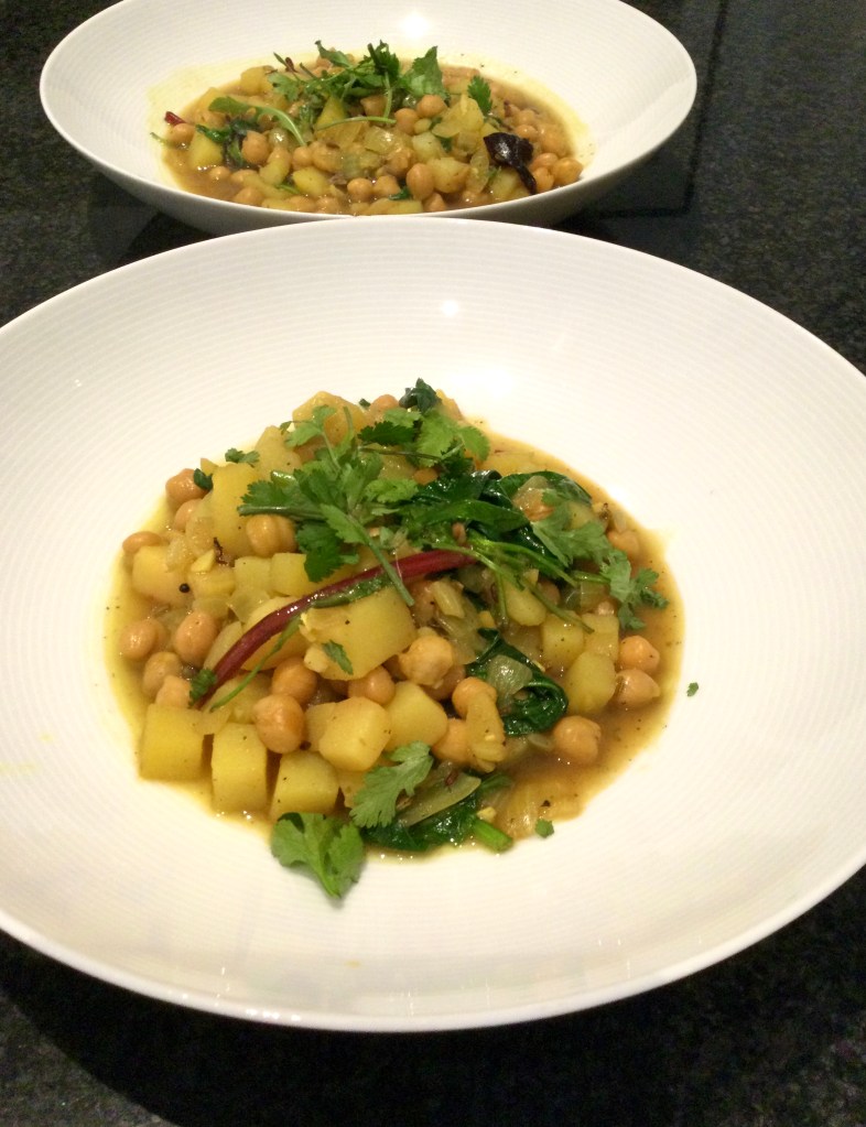 Add the Chickpeas and potatoes in the pan and add water to barely cover the mixture. Cook with a lid on at medium heat for about 10 minutes, until the potatoes are just tender.