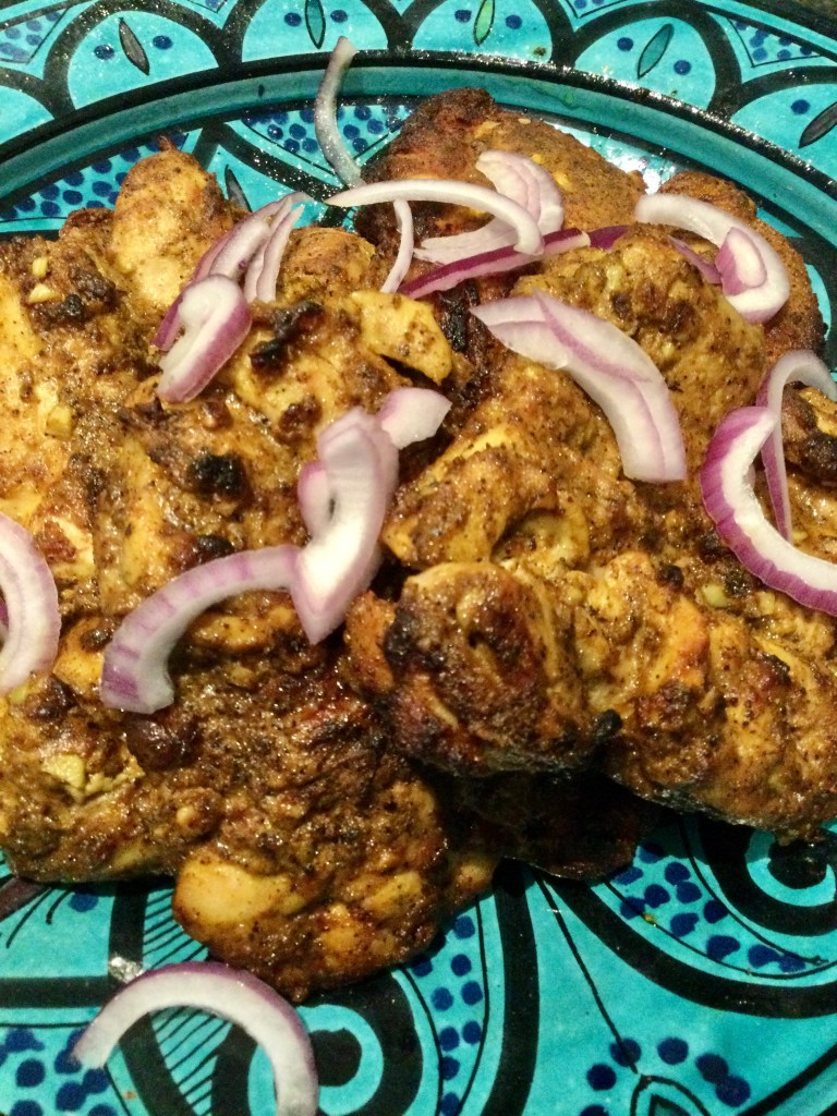 In a medium size bowl, stir in the yogurt, lemon juice, olive oil and minced garlic and mix well. Add all the the other spices and mix well. Take each chicken thigh and dip them in the yogurt-spice mixture on both sides. Leave them to