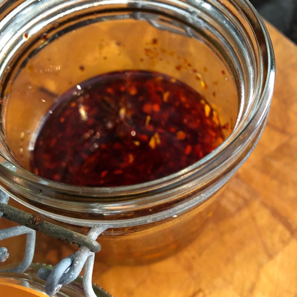 In a small saucepan, heat the vegetable oil to about 110-120 Celsius and when hot enough, pour delicately over the spice mixture. It will sizzle and dazzle you with wonderful aromas. Mix well and let the mixture cool at room temperature. I usually wait a week before using the oil, so all the ingredients have a change to infuse. Delicious !