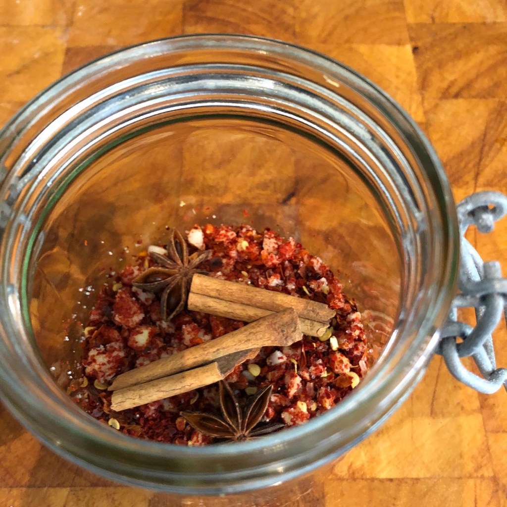 In a small bowl, stir the minced garlic, ginger, both Chilli flakes, cinnamon stick, Star Anise and salt and mix well. Pour all your ingredients in a container which can withstand heat.