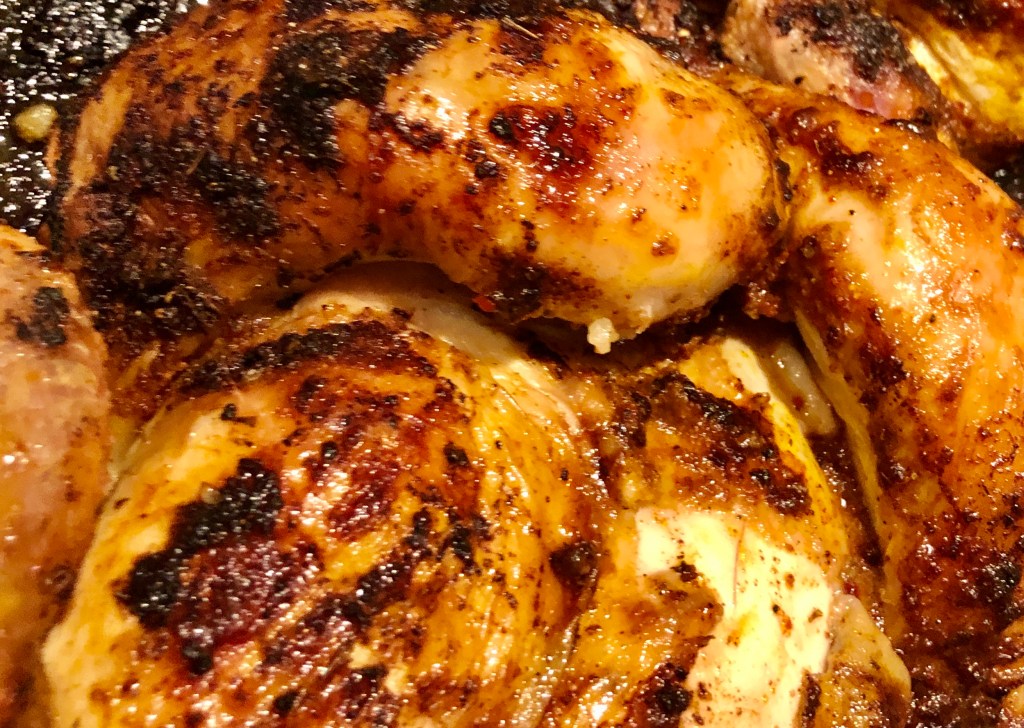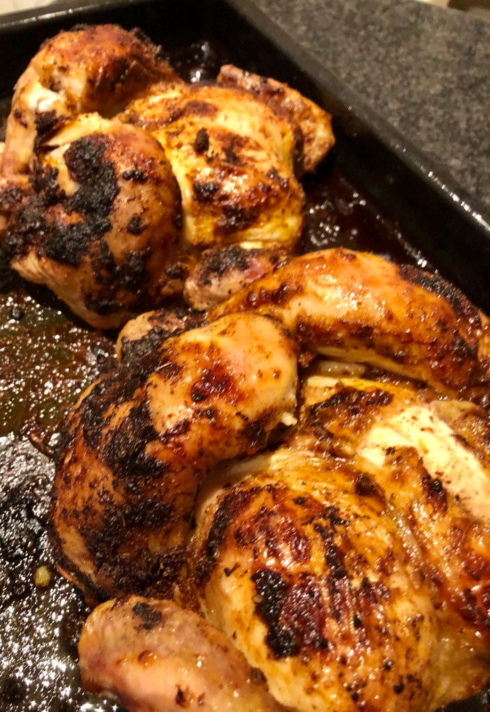 Bake the chicken at 450 degrees F (210 Celsius) with fan on and cook the chicken for 25 minutes – flip over and continue cooking for another 15-20 minutes. (At this stage, you may add sliced potatoes which will cook in the juice)