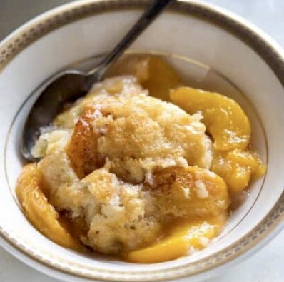 That’s it ! Pour the peach mixture into a medium size baking dish and using an ice cream scoop, cover the peaches with the cake batter.