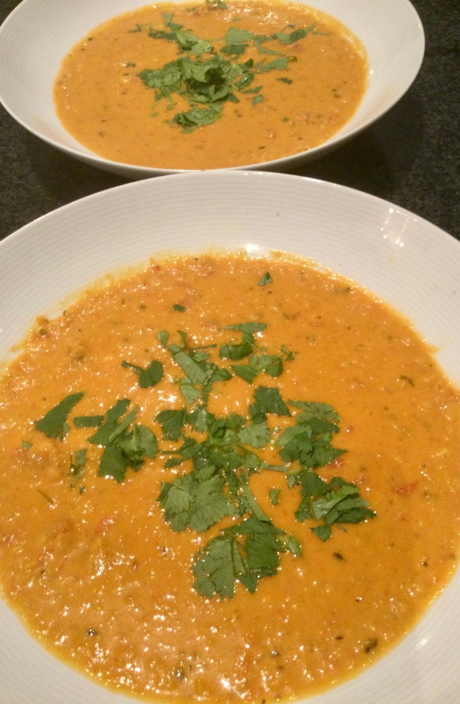 Using a heavy base pressure cooker, saute the onion, garlic and ginger until the onions become translucent. Add all the spices and continue to cook for about two minutes, until the spice release their oil and flavours. Add the lentils and mix well. Add the tomato sauce and two cups of water and stir well.