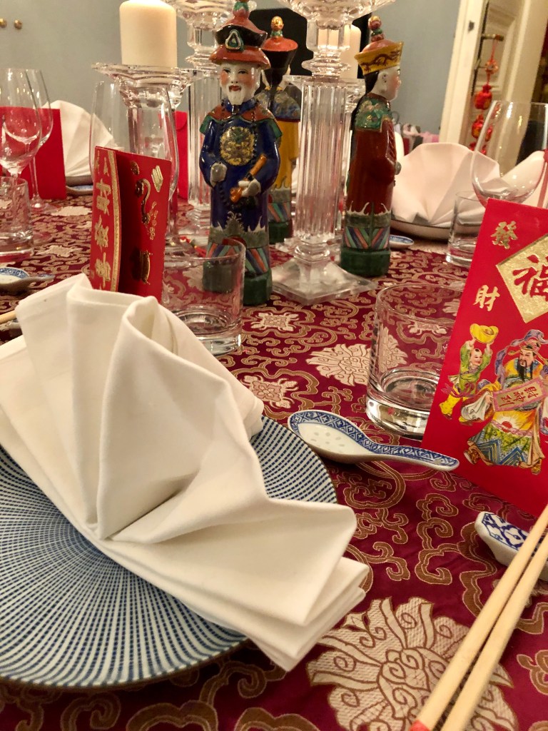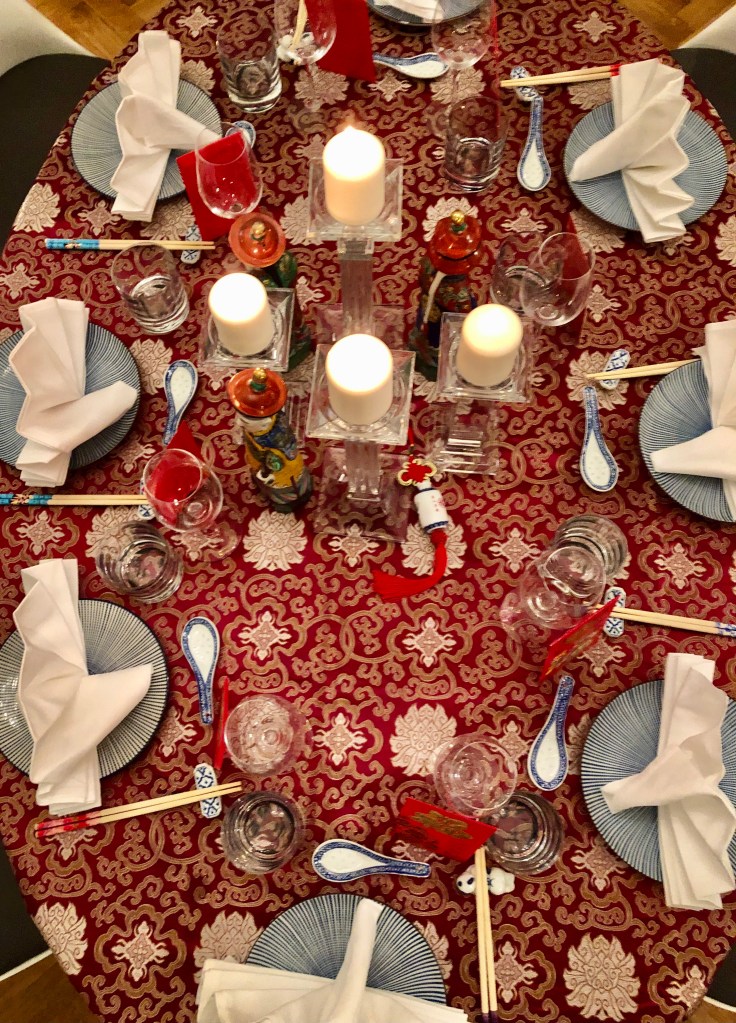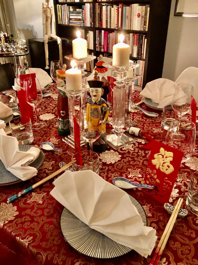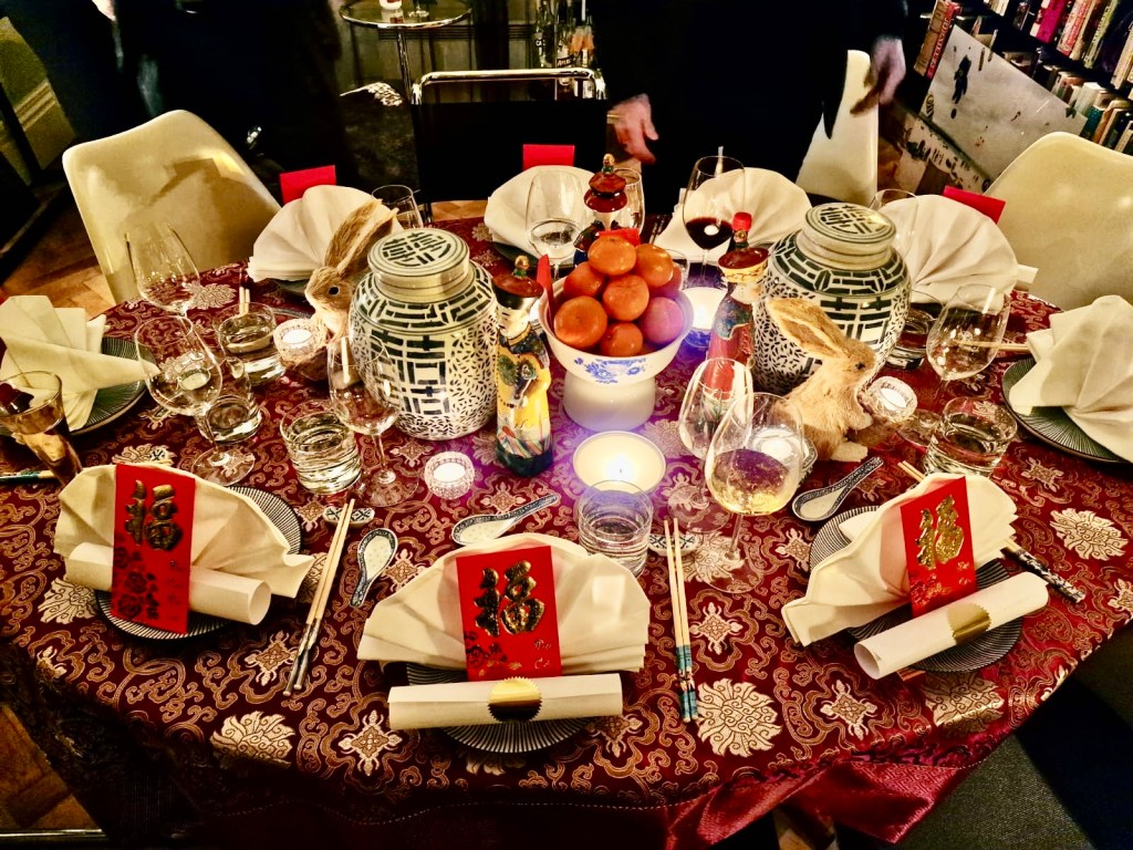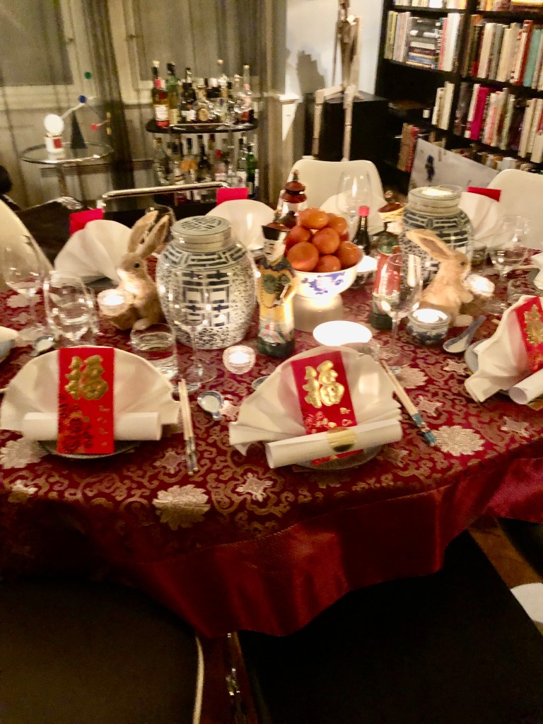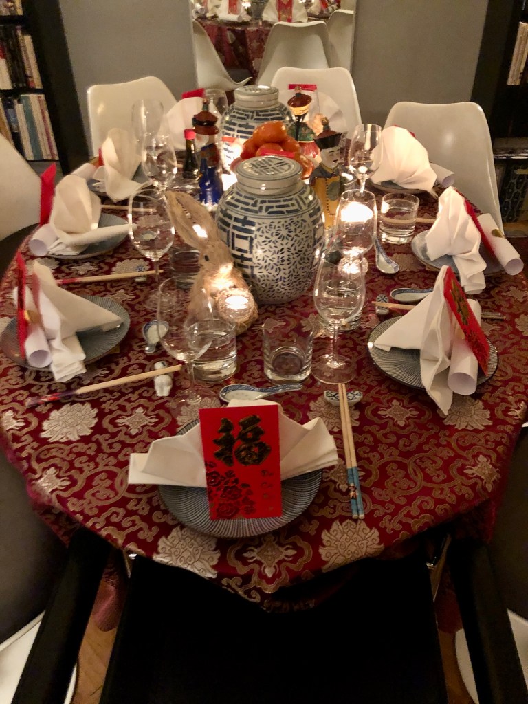 For this year, we decided to do something a little different. Instead of printing horoscope for everyone, we sent all our guests a WhatsApp with their horoscope when they just sat at the table; after all, we are in 2023 ! Have you ever seen a group of guests break all the etiquette rules and open their phone at the table to read what the year of the Rabbit would bring to everyone. Whilst our guests read their predictions, it gave us time to serve the wine and prepare the first course ! On the menu this year, we prepared Sweet & Sour Szechuan Soup, Pork and Cabbage Dumplings with Thai Peanut Butter Sauce, Ground Port in Lettuce Cups and Lemon Chicken with Jasmine Rice. To finish, we served a Truffle Cake (recipe from Kim Sudabar). We had just enough to have another meal, the following day !