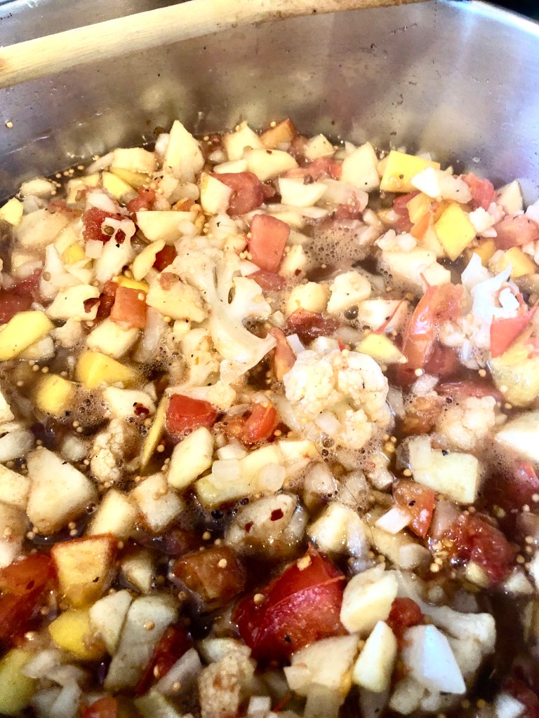 The most complicated part of this recipe is chopping the fruits and vegetables. Once done, pour all the ingredients in a heavy base pot and set the heat to high. Bring the mixture to a boil and then reduce the heat to medium low and cook for about an hour. Stir every now and then to check on the consistency. The mixture will appear very liquid, but the addition of brown sugar will help thicken the ketchup.