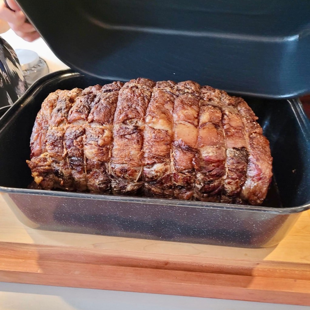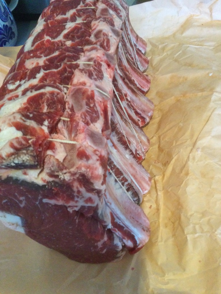 The butcher prepares it with the bones and ensures a good lawyer of fat is added on top of the roast. If not, you can add about 2 ounces – 50 Gr. of Vegetable shortening