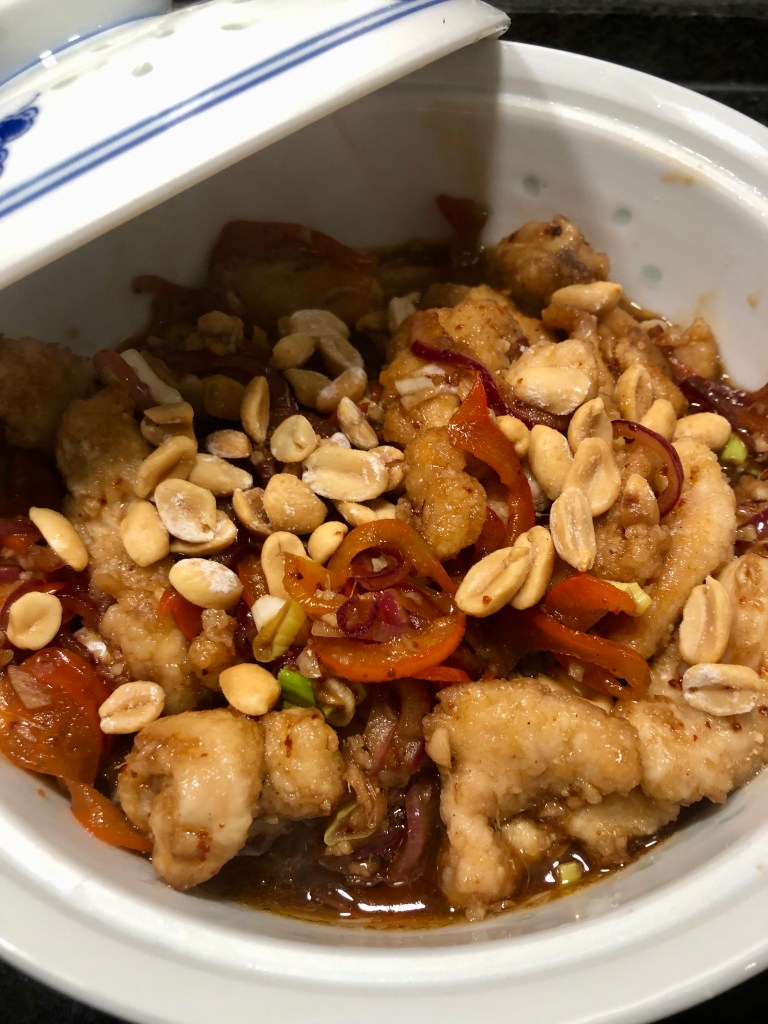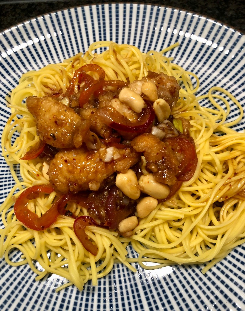 to come back to this recipe, this dish combines all the ingredients which we so enjoy in American-style Chinese food ; sweet, spicy and salty, combined with a lot of umami. It is made with ingredients which are readily available. I double the recipe so we can have it the following day with different accompaniments; rice instead of pasta or steamed vegetables.