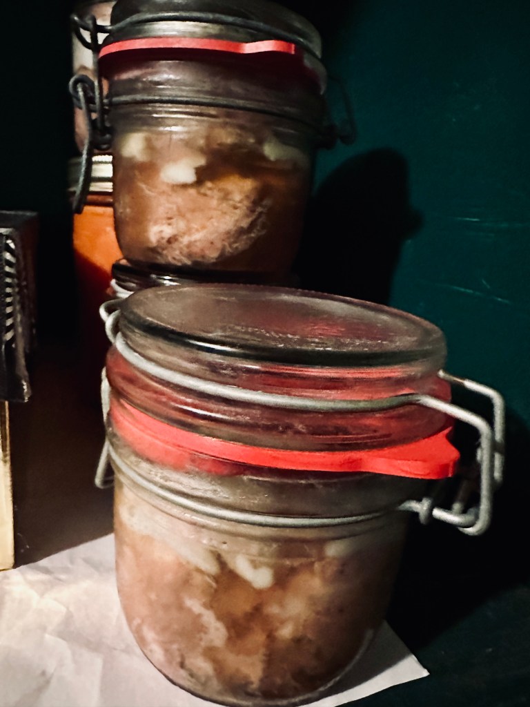 The process could not be easier. Generously salt and pepper the fillet on all sides. Cut the fillet in large strips or slices, depending on the size of jars you use. I use old Foie Gras jars as containers with a rubber ring to ensure they get sealed properly. Place the meat in the jars along with two garlic cloves and one or two thyme sprigs. Add two tablespoons of duck fat if you have, but this is optional. (I ask for a little fat on the meat). Close your jars very thight and use your pressure cooker by adding a wet tea towel at the botton, to prevent the jars from knocking each other during cooking. Place the jars in the pressure cooker and bring a high pressure, then reduce the heat to a minimum and cook for 1 hour and half. That’s it. That simple…