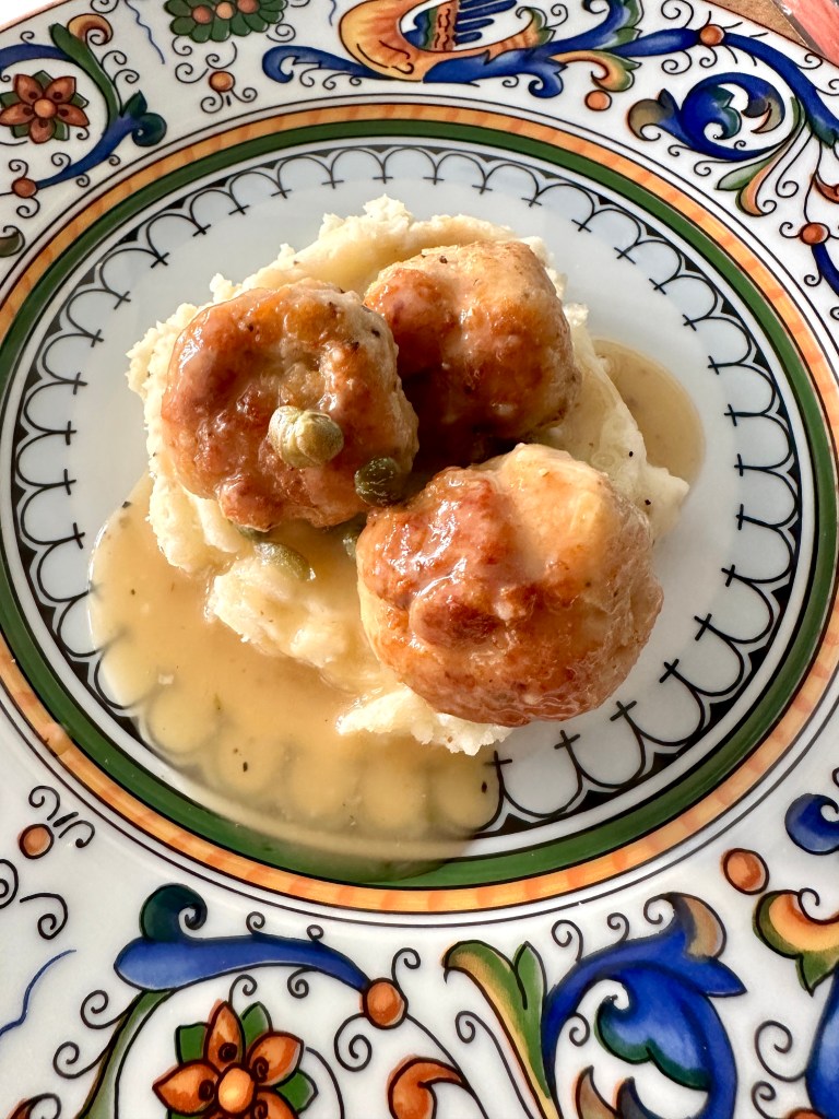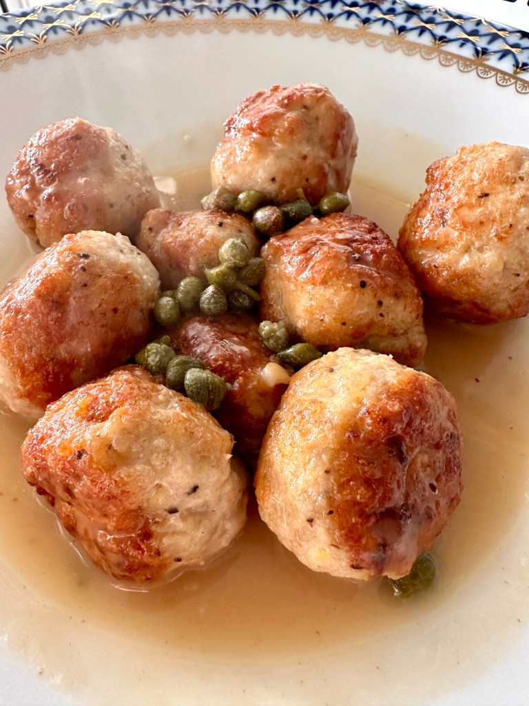 The perfect weeknight dinner ready in less than half hour. If you do not have veal scallops ready at hand, here is a great substitute without sacrificing the taste and elegance. Using half kilo of meat, you can easily serve 4 people for dinner or in our case, prepare the meatballs and freeze half for another meal. This dish offers the same taste as a luxurious veal scallop, without the price tag. Served with fresh pasta or even better, mashed potatoes, a very comforting and satisfying dish.