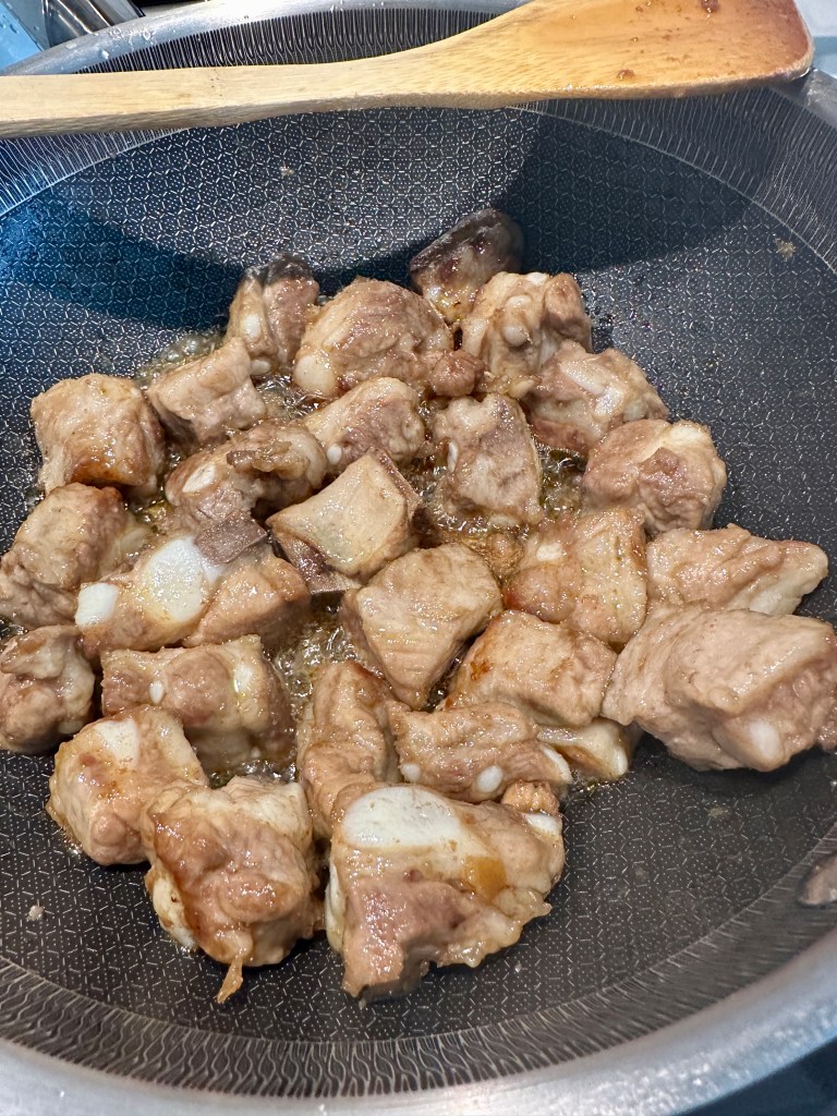When the sugar is caramelized and melted, add the pork ribs and stir-fry until they are brown and sticky.