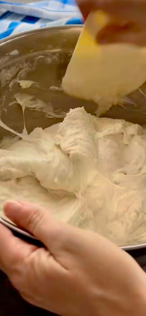 Using a plastic scraper, or as I do, wet your hands and stretch the dough about 5-6 times, until all sides have been folded. Allow to rest for another 20 minutes, covered with a tea towel.