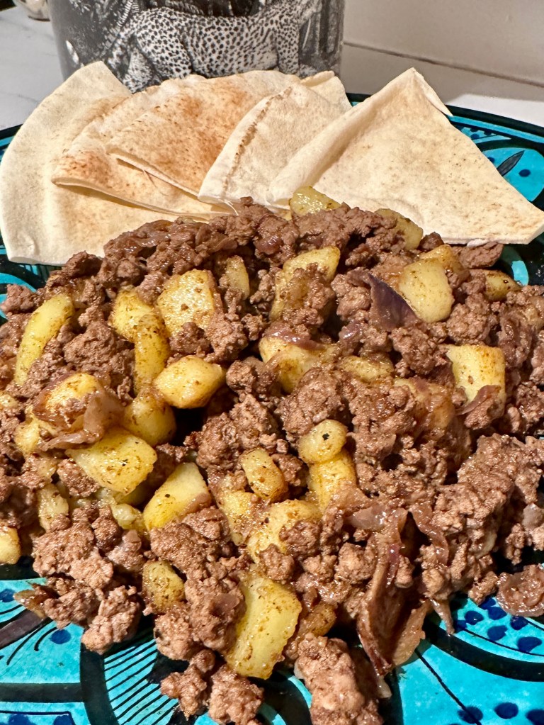 Similar to Hushweh which is a staple in Middle Eastern cuisine as a humble, flavor-packed dish made of ground meat cooked in clarified butter, this dish can be prepared in very little time with ingredients you have at home. A perfect weeknight dish that turn simple ingredients into a Middle Eastern dish with exotic flavours. The addition of sauteed potatoes add to the pleasure of this dish. Served with pickled vegetables and olives, you have a true Lebanese feast which can be prepared in no time.