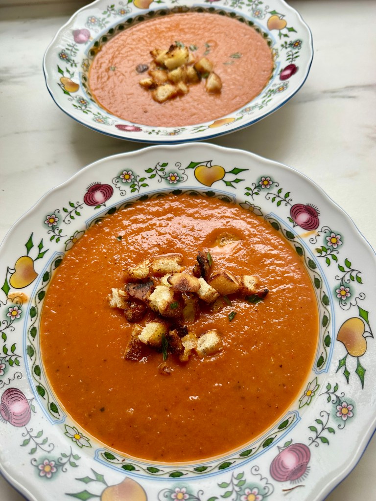 So simple, so easy, yet with very satisfying results. The bulk of the work is done in the oven where the taste of all ingredients appear bright and concentrated in this delectable soup. The beauty of this recipe lies in all the ingredients which are laid in a pan with a dash of salt, pepper, mild paprika and a good quality extra virgin olive oil.