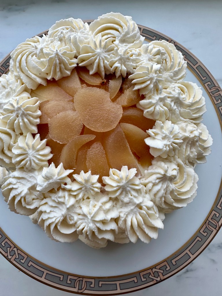 In this instance, I used poached pears, cut in thin slices. For this, you peel two ripe pears and cook them for about 10 minutes, in a mixture of of two cups of water and one cup of sugar. You know the pears are cooked when you insert a knife in the center of the fruit and it gives right away. Cool them on a rack and then slice them thinly.